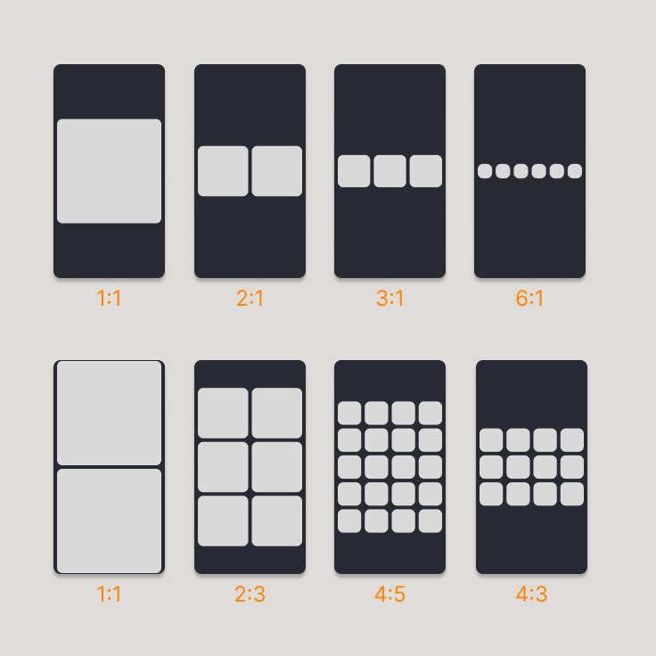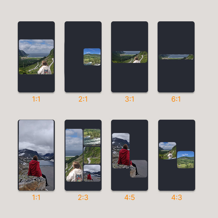 Wische die gesamte Galerie nach rechts und öffne die Einstellungen, um die Anzahl der Zeilen und Spalten anzupassen. Zeilen sind die Anzahl der Kacheln horizontal (von links nach rechts) und Reihen sind die Anzahl der Kacheln vertikal (von oben nach unten). Eine Galerie kann 1 bis 6 Zeilen und Spalten enthalten. So kannst du deine Bild-Collagen ganz nach deinen Wünschen gestalten!