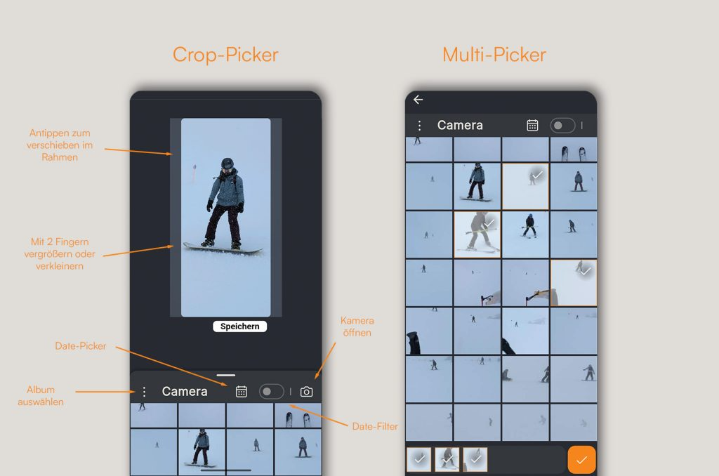 Unser Image-Picker ist darauf ausgelegt, dir das Finden der passenden Bilder zu deinen Erinnerungen so einfach wie möglich zu machen. Du kannst jederzeit auch den systemeigenen Picker verwenden. Ab Version 1.5.20 wurden einige Funktionen verbessert und optimiert. Stelle sicher, dass du die neueste Version installiert hast.