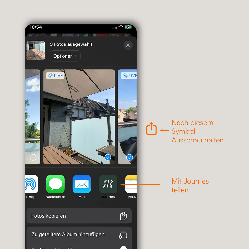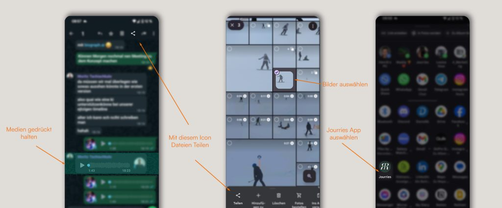 Dieses Feature ermöglicht es dir, Sprachnachrichten, Fotos und andere Dateien aus Apps wie WhatsApp oder direkt von deinem Handy in deine Jourries Memories zu integrieren, sodass du alle wichtigen Momente an einem Ort festhalten kannst.