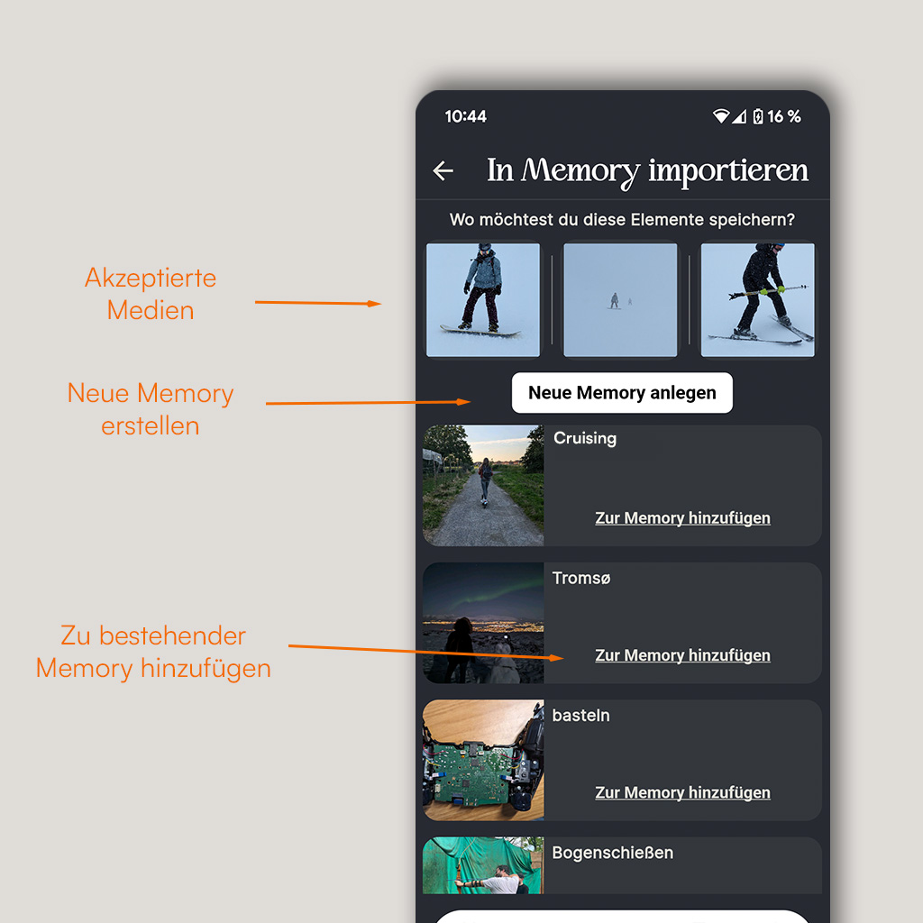 - Zu bestehender Memory hinzufügen: Alternativ kannst du die Dateien zu einer bereits bestehenden Memory hinzufügen.
