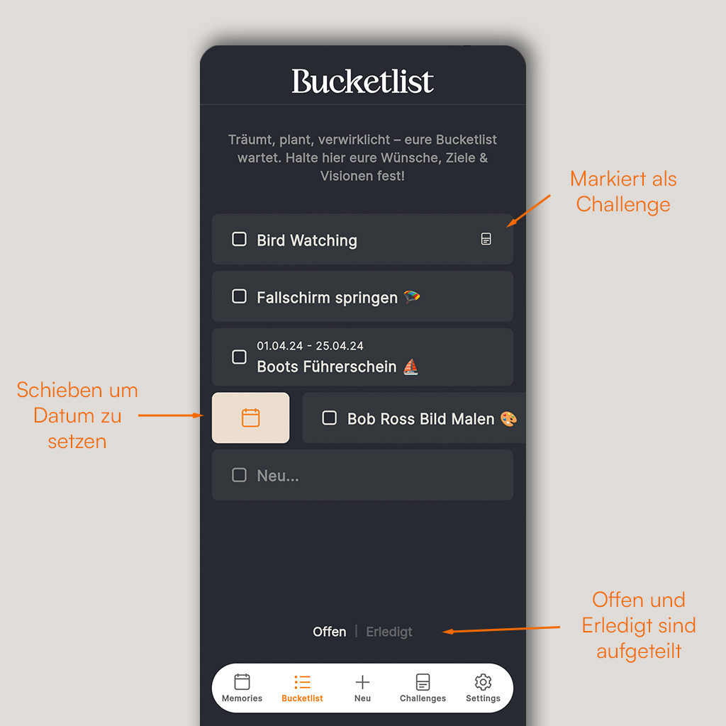 Auch deine Challenges kannst du auf die Bucketliste setzen. Was Challenges sind und wie diese funktionieren, erfährst du hier. Wenn du eine Challenge als erledigt markierst, kannst du daraus sofort eine Erinnerung anlegen, damit das Ganze nie in Vergessenheit gerät. So bleiben deine Erfolge lebendig und du kannst sie immer wieder genießen!